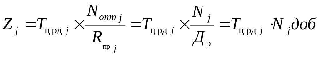 У серійному виробництві нормативний розмір циклового заділу (Zj) j-ї деталі на ділянці визначається за формулою: