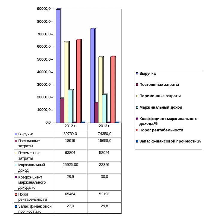 В 2013 году в связи с уменьшением выручки, снижение маржинального дохода составило 3600 тыс. руб. После преодоления точки безубыточности, сумма экономии переменных затрат обеспечивает прямой прирост прибыли компании.