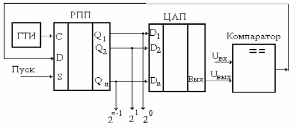 При нажатии кнопки пуск ГТИ заносит в старший разряд РПП единицу, при этом код преобразуется в аналоговый сигнал и сравнивается с входным сигналом - Uвх. В зависимости от выхода компаратора ГТИ записывает "1" в следующий разряд, а предыдущий разряд, либо оставляется без изменения, либо обнуляется.