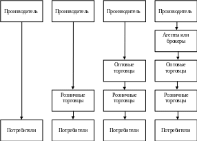 На рисунке 1 приводится схема, где приведены важнейшие типы каналов распределения потребительских товаров, начиная с прямого маркетингового канала, в котором отсутствуют какие-либо посредники (а), и заканчивая сложным его видом, включающим, помимо оптовых и розничных торговцев, также других (функциональных) торговых посредников (г). В других видах каналов распределения функциональные посредники могут находиться между оптовыми и розничными торговцами.