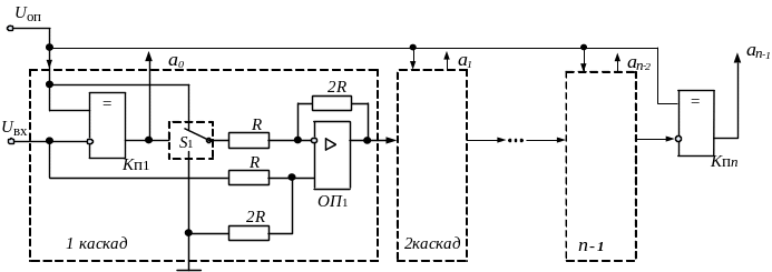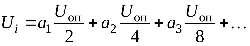 Таким чином на входах компараторів формуються опорні напруги у відповідності з двійковим кодом. У такому зв’язку вхідна напруга , що поступає на кожен з компараторів, буде представлена у двійковому коді у вигляді вихідних напруг (логічних або ) компараторів. Очевидно, що з збільшенням розрядності число різних номіналів резисторів зростає, одночасно збільшуються вимоги до мінімального опору відкритих каналів перемикачів (особливо ), з’являється необхідність підключення кількох, паралельно працюючих ключів, замість одного.