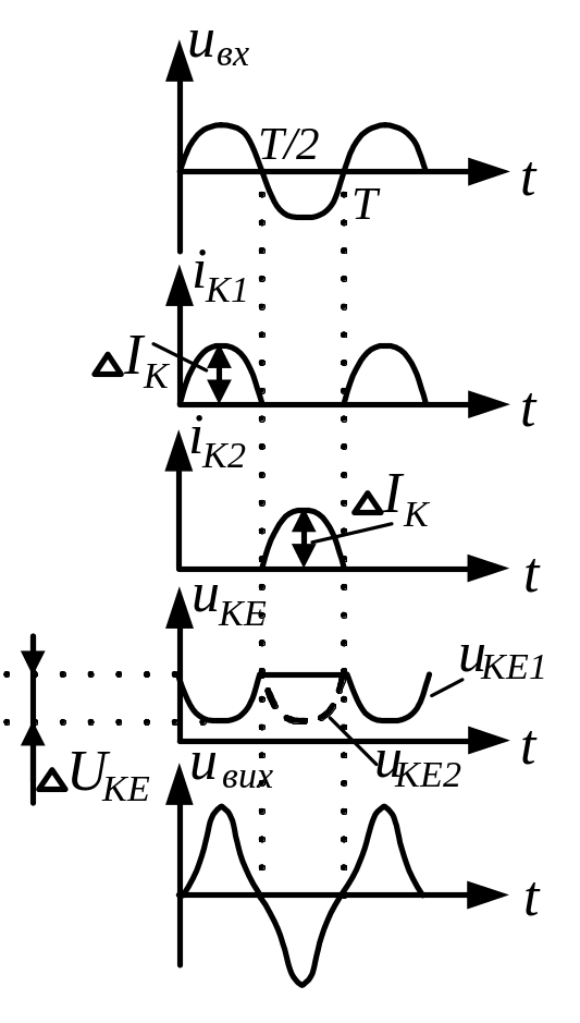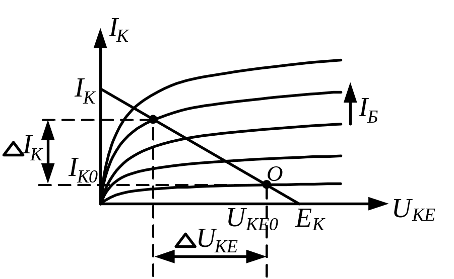 На рис. 1.37 та рис. 1.38 зображені сімейство вихідних характеристик для схеми зі СЕ та часові діаграми її роботи.