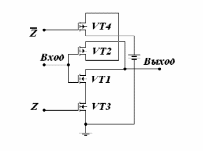 Транзисторы VT1 и VT2 представляют собой обычный КМДП инвертор, подключенный к источнику питания и общей шине через транзисторные ключи, построенные на транзисторах VT3 и VT4.
