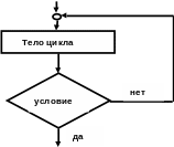 Структура «Повторение с постусловием» называется так потому, что в этой циклической структуре сначала выполняется тело цикла, а затем проверяется истинность условия. Если условие принимает значение False, то опять выполняется тело цикла; а если условие принимает значение True, то происходит выход из цикла. Так как сначала выполняется тело цикла, а уже потом проверяется истинность условия, то в данном цикле тело цикла всегда выполнится хотя бы один раз.