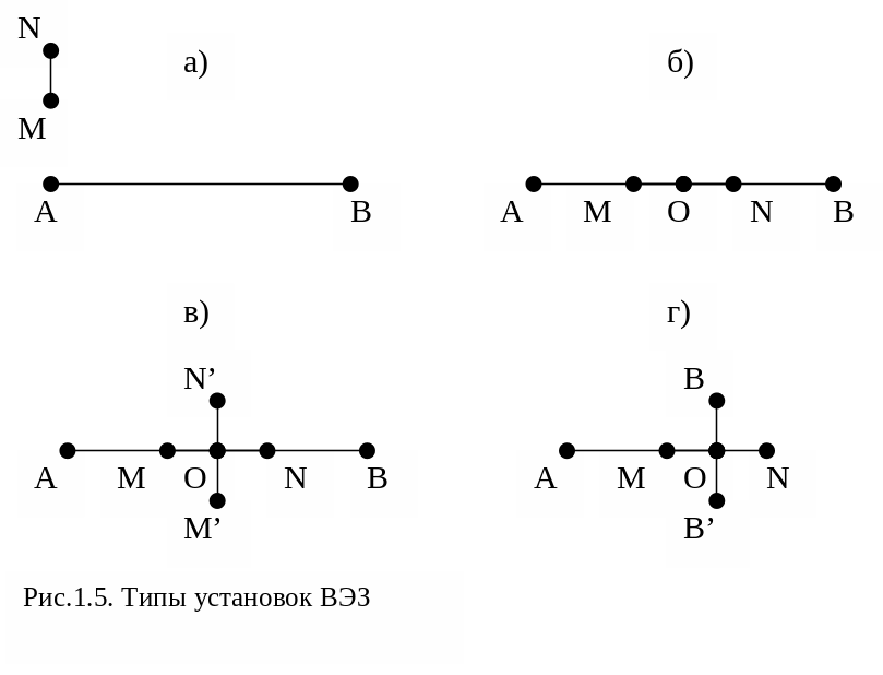 Иногда для того, чтобы не относить при работе трехэлектродной установкой электрод В «на бесконечность», используют два заземления, В и B', которые располагают на линии проходящей через точку О ортогонально линии разносов. На эти электроды подается ток и, корректируя положение одного из электродов, добиваются отсутствия сигнала на приемных электродах MN. После этого производятся измерения по трехэлектродной схеме, а пара ВВ’ используется вместо электрода В, унесенного далеко. Такое зондирование называют «однополюсным комбинированным» (Рис.1.5 г).