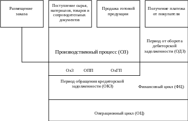 Операционный цикл (ОЦ) характеризует общее время, в течение которого финансовые ресурсы обездвижены в запасах и дебиторской задолженности.