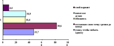 Здесь мы наблюдаем высокий процент тех, кто до конца отстаивает свою точку зрения – 39,6%. Довольно тревожный показатель, так как подобное нежелание уступать может привести к печальным последствиям, вплоть до ухода из жизни.