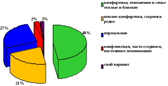 Своего варианта в этом вопросе предложено не было, и отрицательную оценку положения в семье также никто не дал. Это положительный показатель. Подростки, в целом, оценивают реально положение в семье. Вместе с тем, нельзя исключать и вероятности того, что желаемое выдается за действительное.