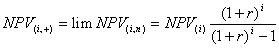 Для иллюстрации способа рассмотрим пример.Если проводится анализ десятков проектов, отличающихся по длительности их действия, расчеты занимают больше времени.В этом случае их можно упростить, если предположить, что каждый из анализируемых проектов реализован неограниченное число раз. В этом случае число слагаемых в формуле расчета NPV(i,n) будет стремиться к бесконечности, а значение NPV(i,+) может быть найдено по формуле для бесконечно убывающей геометрической прогрессии: