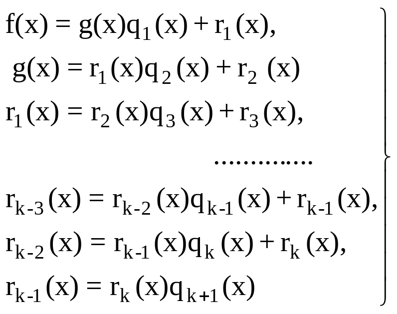 Алгоритм Евклида для многочленов состоит в следующем: Пусть даны многочлены f(x) и g(x) из P[x]. Делим f(x) на g(x) и получаем некоторый остаток r1(х) P[x]. Если r1(х)0, то делим затем g(x) на r1(х) и получаем остаток r2 (х) P[x]; делим r1(х) на r2 (х) и и т. д. Так как степени остатков все время понижаются, то в этой цепочке последовательных делений мы должны дойти до такого места, на котором деление совершится нацело и поэтому процесс остановится.