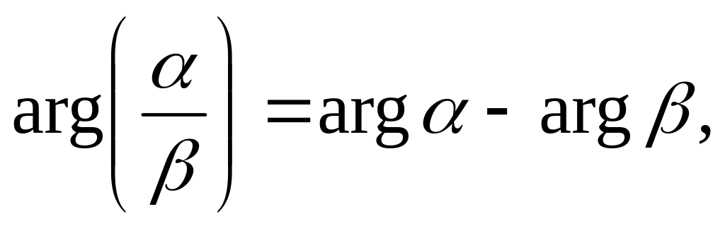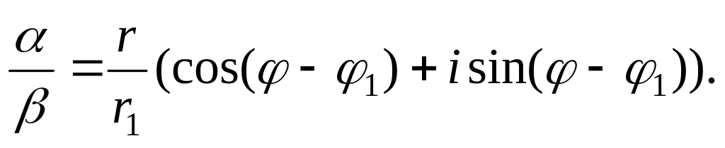 В тригонометрической форме удобно умножать и делить комплексные числа. Нетрудно проверить, используя формулы синуса и косинуса суммы и разности двух углов (см., например, [1]), что справедливы следующие правила: если α=r(cosφ+isinφ) и β=r1(cosφ1+isinφ1), то αβ=rr1(cos(φ+φ1)+isin(φ+φ1)), (5)