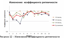 На Рисунке 7 показана ритмичность производства всех продуктов в каждом месяце отдельно. Для наглядности полученные в ходе вычислений точки соединены линиями.