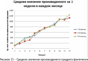 Рисунок 11 посвящен среднему значению производимой продукции фактически, что необходимо для подробного анализа сложившейся ситуации на производстве. На графике можно пронаблюдать изменение производимой продукции по факту, т.е. динамику производства.