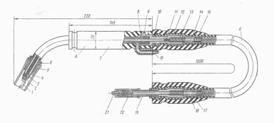 ручка 7. Під'єднання держака до рукава і підвід до нього електродного струму здійснюється при допомозі стикового з'єднання 8 з гвинтом 9.Конструкція держака забезпечує швидку і легку заміну сопла і наконечника для знімання їх і очищення від капель розплавленого металу. Гнучкий рукав складається з двох стальних спіралей, (внутрішня 11 і зовнішня 13), які знаходяться вплетенці 14 і гумовій трубці 12. В передній частині рукава закріплений покритий гумою 15 наконечник 10, що при допомозі стикового з'єднання приєднаний до держака. З іншої його сторони є струмозмішувач, що складається з направляючої трубки 21, що притискається гайкою до наконечника 19.Струмозмішувач покритий шаром гуми 17. При роботі держака з таким рукавом пучкова кнопка встановлюється на ручці захисного щитка зварювальника і виключається великим пальцем лівої руки. Дроти пускової кнопки поєднуються до штангельного роз'єму, що є на подаючому механізмі.