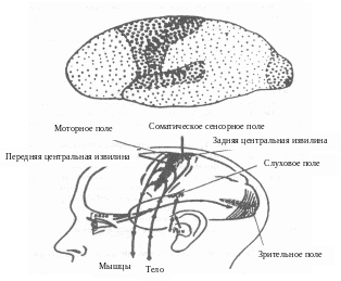 Первичные поля связаны с органами чувств и органами движения на периферии. В каждом полушарии выделяются первичные зоны представительства различного рода чувствительности. Они обеспечивают возникновение ощущений. К ним относятся, например, поле болевой и мышечно-суставной чувствительности в задней центральной извилине коры (так называемая соматосенсорная зона), зрительное поле в затылочной области, слуховое поле в височной области и моторное поле в передней центральной извилине. В соматосенсорной зоне человека особенно большую поверхность занимает представительство рецепторов кисти рук, голосового аппарата и лица, значительно меньшую – туловища, бедра и голени. Эти различия отражают различия в количестве рецепторных образований, имеющихся в коже туловища и наиболее чувствительных участков тела – губах, языке, подушечках пальцев (рис. 16).