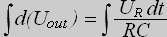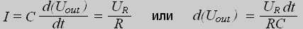 Элементы R и C соединены последовательно, значит, ток в их цепи можно выразить, исходя из производной напряжения заряда конденсатора dQ/dt = C(dU/dt) и закона Ома U/R. Напряжение на выводах резистора обозначим UR. Тогда будет иметь место равенство: