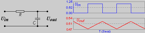 В качестве примера, сигнал с генератора - положительный меандр 1V периодом 2 mS подадим на вход простой интегрирующей цепиRC с номиналами: R = 10 kOhm, С = 1 uF. Тогда τ = RC = 10 mS.