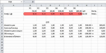 Введем значения коэффициентов целевой функции: ячейки B3:G3 на рисунке 1.