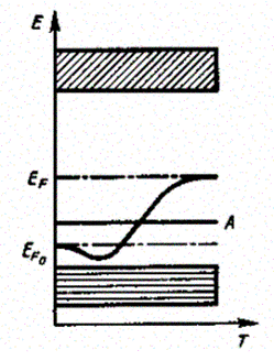 С повышением температуры все большее число электронов переходит из донорных состояний в зону проводимости, но, помимо этого, возрастает и число тепловых флуктуации, способных возбуждать электроны из валентной зоны и перебрасывать их через запрещенную зону энергий. Поэтому при высоких температурах уровень Ферми имеет тенденцию смещаться вниз (сплошная кривая) к своему предельному положению в центре запрещенной зоны, характерному для собственного полупроводника.