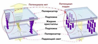 В основе любого ЖК-дисплея лежит конструктивный принцип. Основой для последующих слоев ЖКИ являются две параллельные стеклянные пластины с нанесенными на них поляризационными пленками. Различают верхний и нижний поляризаторы, сориентированные перпендикулярно друг другу. На стеклянные пластины в тех местах, где в дальнейшем будет формироваться изображение, наносится прозрачная металлическая окисная пленка, которая в дальнейшем служит электродами. На внутреннюю поверхность стекол и электроды наносятся полимерные выравнивающие слои, которые затем полируются, что способствует появлению на их поверхности, соприкасающейся с ЖК, микроскопических продольных канавок. Пространство между выравнивающими слоями заполняют ЖК веществом. В результате молекулы ЖК выстраиваются в направлении полировки выравнивающего слоя.