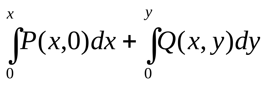 Теперь ищем потенциал. Для этого вычислим криволинецный интеграл от точки (0,0) до произвольной точки (x,y). Так как он не зависит от пути, выберем для простоты ломаную, так чтобы отрезки были вдоль осей