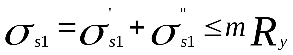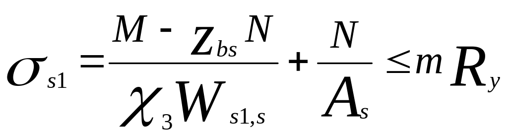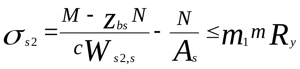 Затем эти усилия следует перенести в центр тяжести стального сечения с соответствующим изгибающим моментом M=Nzbs на плече переноса zbs, после чего представляется возможным по нижеприведенным формулам внецентренного сжатия проверить прочность верхнего пояса стального сечения