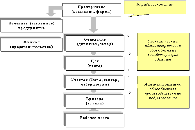 Производственная структура предприятия включает дочерние и зависимые предприятия (самостоятельные юридические лица), филиалы и представительства, создаваемые предприятием на других территориях, а также производственные подразделения, непосредственно входящие в состав предприятия. В состав производственных подразделений предприятия могут входить: