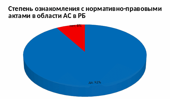 В нашем исследовании мы задавали вопросы респондентам по 9 основным аспектам, чтобы оценить и в последствии сделать вывод о принимаемых управленческих решениях в области адаптивного спорта в Республике Беларусь. Первый аспект, который мы затронули, это правовой. Мы выяснили степень ознакомления представителей отрасли с существующей нормативно-правовой базой регламентирующей адаптивный спорт в Республике Беларусь.