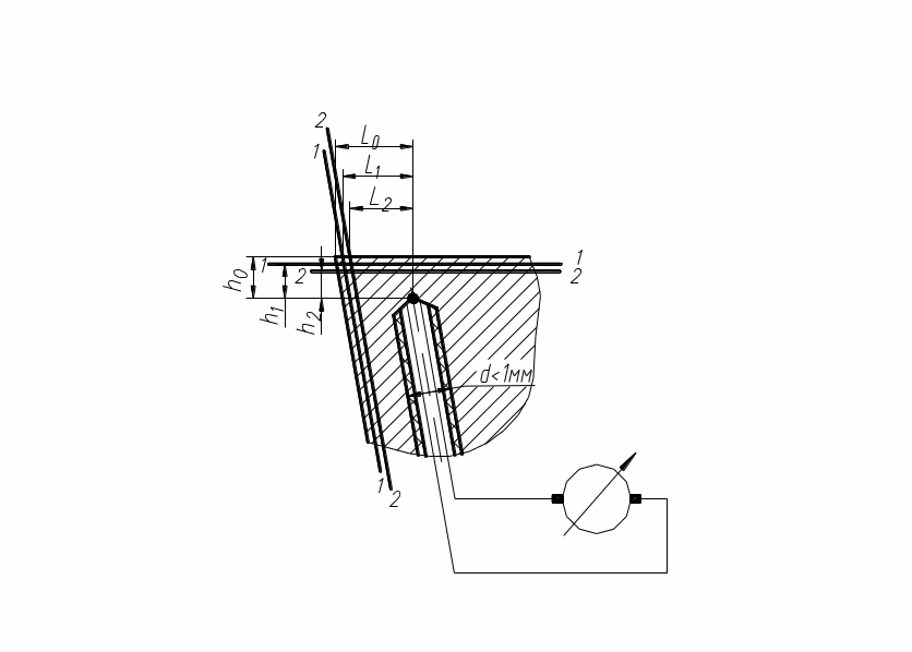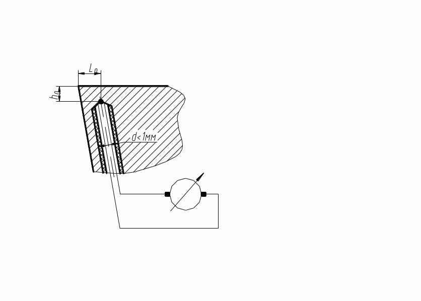 Кроме этого, Я.Г. Усачев предложил и другой метод измерения температур в зоне резания. С этой целью в резце сверлится канал диаметром 1 мм, который около задней поверхности переходит в отверстие диаметром 0,4 мм (рис.3.5). В это отверстие затягивается константановая проволочка, изолированная от широкой части канала стеклянной трубочкой. Конец проволочки на задней поверхности расклепывается. Элементами термопары являются проволочка и резец. Такая термопара называется полуискусственной. Недостатком ее является сложность изготовления специальных резцов, которые допускают малое количество переточек. К тому же показания термопары дают заниженные значения температуры резания, так как горячий спай термопары расположен не на самом режущем лезвии, а на некотором удалении от него.