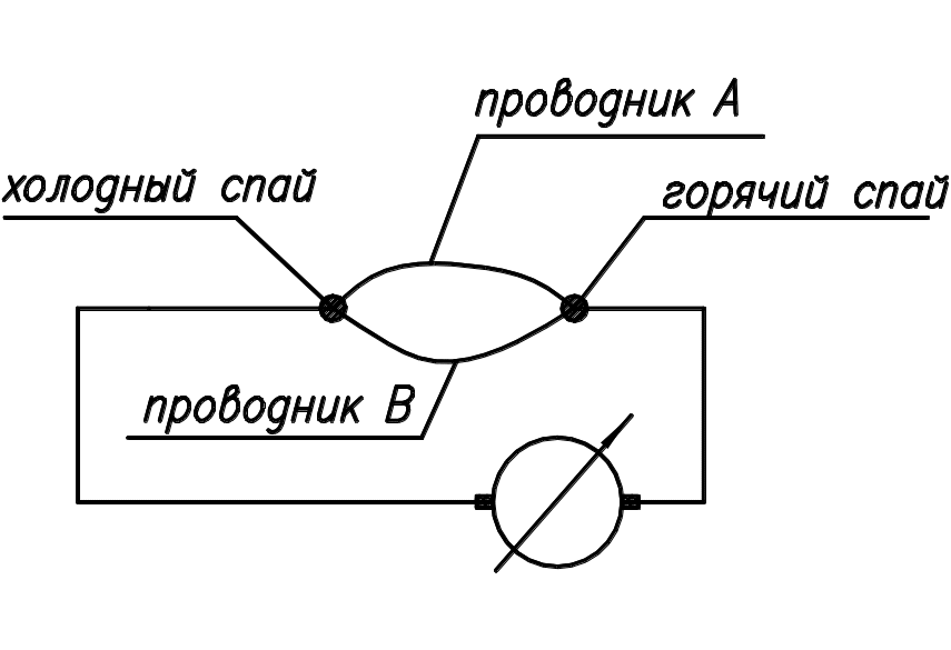 Если в цепи, состоящей из двух проводников А и В (рис. 3.3) соединенных между собой в точках 1 и 2, менять температуру одной из точек, то в цепи появится ЭДС, называемая термоэлектродвижущей силой и являющаяся функцией разности температур мест соединения проводников.