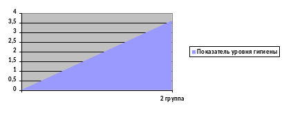 Как видно из данных диаграмм, обращает на себя внимание выявленный в ходе проведения исследования факт, что у детей в 1 группе во время осмотра гигиена полости рта находилась в основном на удовлетворительном (0,7-1,6) и неудовлетворительном (1,7-2,5) уровне, а во 2 группе неудовлетворительном (2,1-2,5), плохом (2,6-3,4) и очень плохом (3,5-3,6) уровне. Высокие показатели индекса гигиены указывают на недостаточную профилактическую работу или ее отсутствие.
