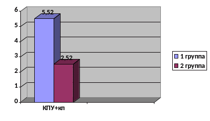 Показатель интенсивности кариозного процесса (индекс КПУ+кп) в 1 группе составил 5,52 и оценивается как высокий уровень интенсивности. Во 2 группе индекс равен 2,52 и оценивается как низкий.