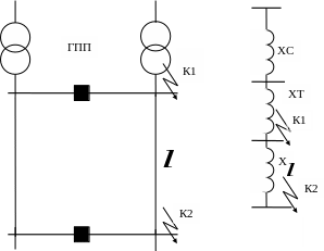 По расчётной схеме составляем схему замещения, в которой каждый элемент заменяем своим индуктивным сопротивлением (рисунок 6).