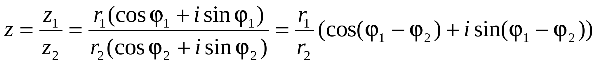 , т.е. модуль частного двух комплексных чисел z1 и z2 равен частному модулей, а аргумент частного – разности аргументов.