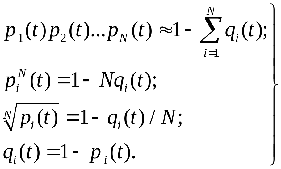 При расчете надежности систем часто приходится перемножать вероятности безотказной работы отдельных элементов расчета, возводить их в степень и извлекать корни. При значениях P(t), близких к единице, эти вычисления можно с достаточной для практики точностью выполнять по следующим формулам (для N однотипных элементов):