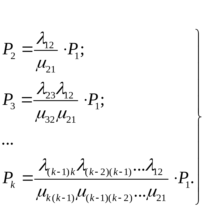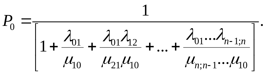 Запись для вероятности k-го состояния в (4.27) следует читать так: вероятность k-го состояния равна произведению коэффициента на вероятность первого состояния Р1. Коэффициент равен дроби, числитель которой – произведение интенсивностей отказов, стоящих над стрелками, идущими вправо до k-го состояния, а знаменатель – произведение интенсивностей восстановлений, стоящих над стрелками, идущими влево от k-го состояния до первого.