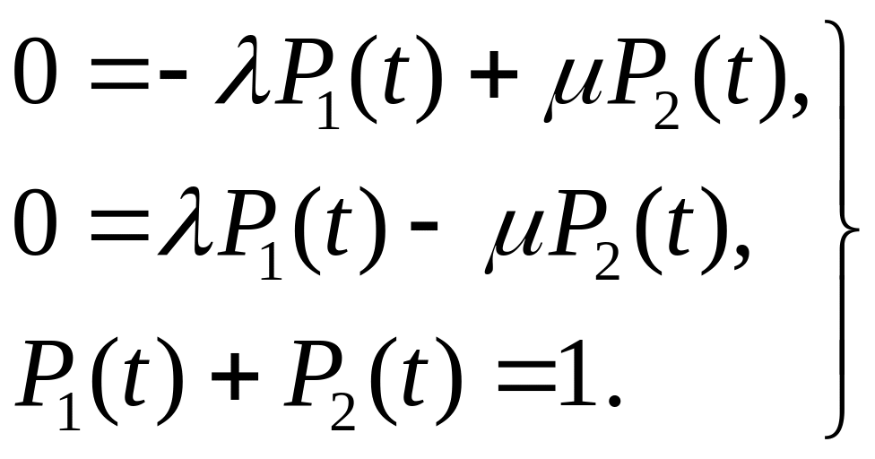 Исследования характеристик надежности, формируемых под воздействием потока отказов и восстановления, позволяют сделать вывод о том, что при существующих соотношениях λ и µ сравнительно быстро наступает период установившегося режима, когда вероятности состояний объекта становятся постоянными, т.е. dPj(t)/dt=0. Тогда система дифференциальных уравнений (4.23) становится системой алгебраических уравнений: