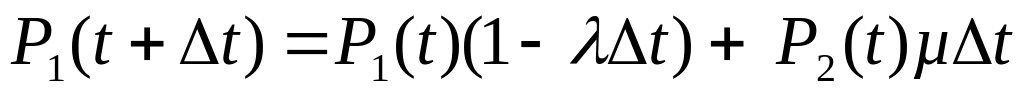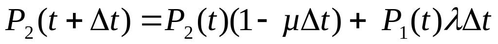 Рассмотрим поведение системы в интервале времени [0,t+Δt]. Тогда система в момент t+Δt будет находиться в состоянии 1, если она в момент времени t находилась в этом состоянии, и за время Δt не наблюдалось отказов, а также если система в момент времени t находилась в состоянии 2, и за время Δt был закончен ее ремонт. Тогда по формуле полной вероятности