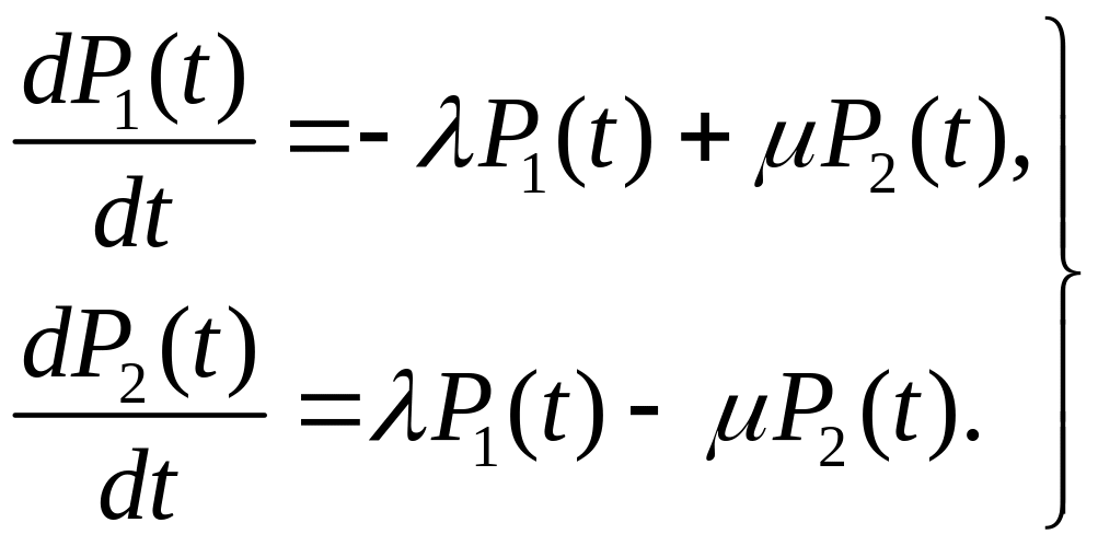 На рисунке 4.19 кружки с номером означают состояние системы, а стрелки (дуги) направление переходов системы и вероятности этих переходов за бесконечно малый интервал времени. Вероятность переходов в силу сделанных предложений и свойства показательности закона надежности не зависят от времени. Введем вероятности нахождения системы в состоянии 1 и 2 как Р1(t) и Р2(t). Очевидно, что Р1(t) + Р2(t)=1 для любого момента времени.