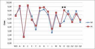 Из представленных данных видно, что для мужчин по сравнению с женщинами характерны более низкие значения фактора О «уверенности в себе – тревожность», т.е. более низкие значения тревожности, депрессивности, ранимости на фоне большей уверенности в себе.