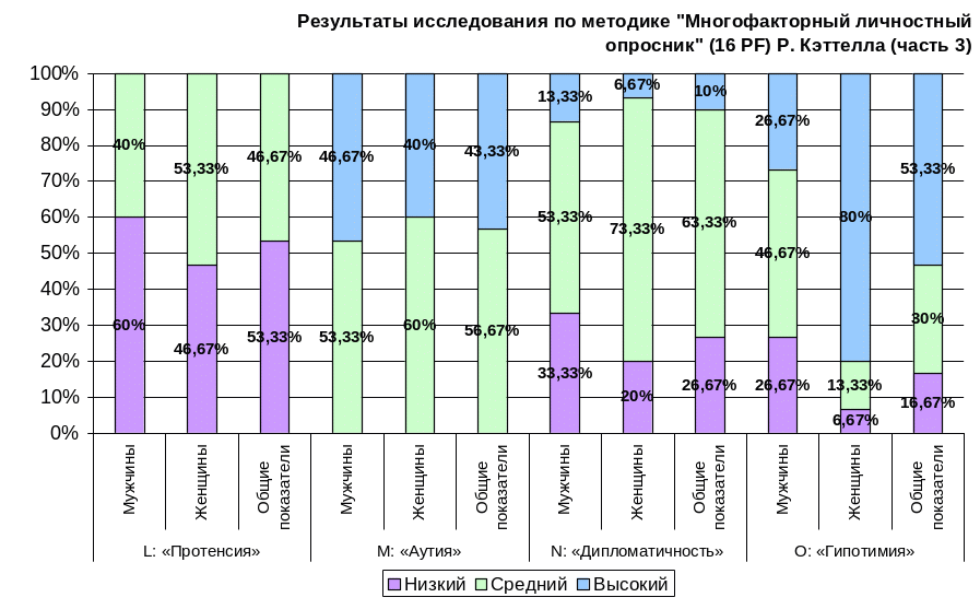средний уровень с тенденцией к высокому по показателям чувствительности (I), воображение (М), общей групповой тревожности (О) (у мужчин преобладает средний уровень, у женщин преобладает высокий уровень);