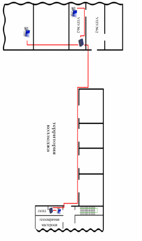 Разработана схема прокладки кабеля - внутренняя и внешняя прокладка кабеля. Внутренняя прокладка осуществляется в кабинетах с помощью кабель канала из пластика. Внешняя проводка проводится с помощью специального экранированного кабеля, прокладывается на внешней стене строений и не требует никакого защитного кабель канала.