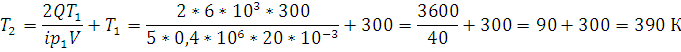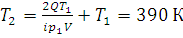 Баллон вместимостью V = 20 л содержит водород при температуре T1 = 300 К под давлением p1 = 0,4 МПа. Каковы будут температура T2 и давление p2, если газу сообщить количество теплоты Q = 6 кДж.