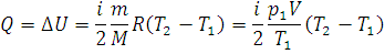 Водород занимает объём V1 = 10 м3 при давлении p1 = 100 кПа. Газ нагрели при постоянном объёме до давления p2 = 300 кПа. Определить: а) изменение ΔU внутренней энергии газа; б) работу A, совершённую газом; в) количество теплоты Q, сообщённое газу.