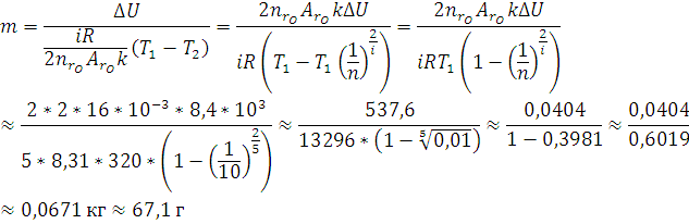 При адиабатном расширении кислорода с начальной температурой T1 = 320 К внутренняя энергия уменьшилась на ΔU = 8,4 кДж, а его объём увеличился в n = 10 раз. Определить массу m кислорода.
