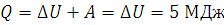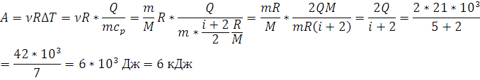 Азот нагревался при постоянном давлении, причём ему было сообщено количество теплоты Q = 21 кДж. Определить работу A, которую совершил при этом газ, и изменение ΔU его внутренней энергии.
