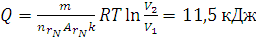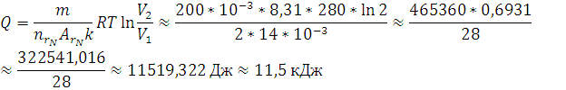 Азот массой m = 200 г расширяется изотермически при температуре T = 280 К, причём объём газа увеличивается в два раза. Найти: а) изменение ΔU внутренней энергии газа; б) совершённую при расширении газа работу A; в) количество теплоты Q, полученное газом.