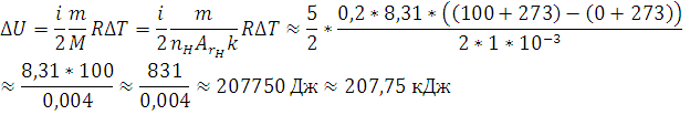 Определить количество теплоты, поглощаемой водородом массой m = 0,2 кг при нагревании его от температуры T1 = 0°C до температуры T2 = 100°C при постоянном давлении. Найти также изменение внутренней энергии газа и совершаемую им работу.