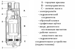 от электродвигателя постоянного тока расположен непосредственно в корпусе насоса и работает в топливе. Смазка трущихся поверхностей осуществляется протекающим топливом. Обратный клапан, установленный в насосе, предотвращает стекание топлива из топливопровода высокого давления в бак после выключения зажигания.