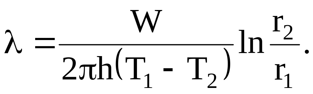 Один з найбільш поширених методів вимірювання коефіцієнта теплопровідності газів полягає у заповненні досліджуваним газом простору між двома коаксіальними циліндрами радіусами r1 і r2 , один з яких (переважно внутрішній) нагрівається електричною піччю потужністю W, а другий охолоджується з підтриманням сталої температури T2. Внутрішній циліндр, виготовлений з тонкого дроту, через який проходить електричний струм, одночасно є нагрівачем. Через деякий час після ввімкнення нагрівача встановлюється стаціонарний стан, при якому температура T1 внутрішнього циліндра, що нагрівається, теж постійна.